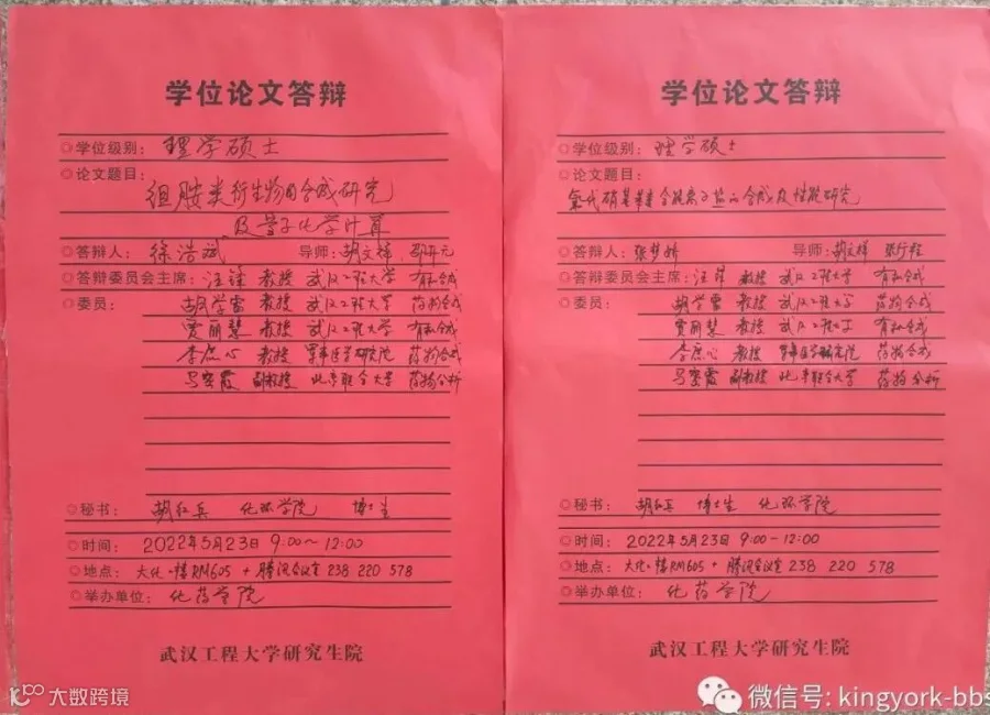 【武汉5月23日讯】2022年5月23日徐浩斌同学和张梦娇同学的硕士研究生答辩顺利完成。