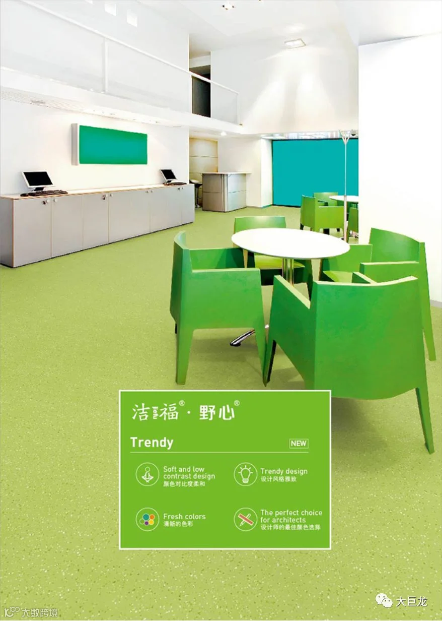 洁福®野心®同质透心地板具有步感舒适,抗菌防滑,隔声防腐和色彩丰富的特点,该产品无DOP,无重金属,无苯,无甲醛,28天后TVOC排放量检测值小于100μg/m3,100%符合欧盟REACH法规,健康环保。适合于医疗,教育,商业,工业,交通,运动和办公场合的使用。