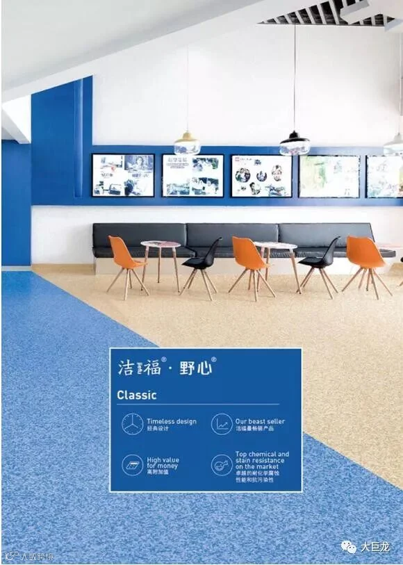 洁福®野心®同质透心地板具有抗菌和防霉特点,其耐磨程度达到T级,优异的耐磨性适合与人流量大的地方及经常使用化学物质及较脏污的区域。抵抗污染的坚固壁垒,卓越的抗化学试剂及污染性能,100%卫生,不含任何污染物质,杜绝病菌滋生。终生无需打蜡,维护保养更便捷,对环境影响极小。