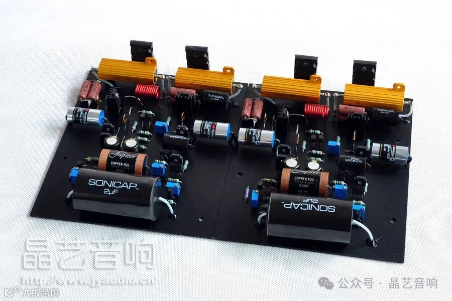 首先,我们要列举一下音箱灵敏度,听音环境对功率的要求的关系。人耳对乐器要求逼真还原大约需要85-90分贝的音压,86DB的音箱上,距离5米的情况下,要达到这样的音压,功率是16W,此时功放因为需要的保留余量,功率需要80W 以上。换一句话说,假如功放是纯甲类的设计,势必功耗极大,致命的是必须采用输出管多对并联的办法才能获得这样的功率。多对并联的输出管必然受配对限制,配对不对称多对管叠加后其失真会将甲类无开关失真的优势丧失殆尽,甚至更差。因此很多纯甲机听起来仍然十分生硬的缘故。采用一对的输出管的优势就在于其配对误差不会被叠加。上面已经提及,晶艺的功放输出级晶体管采用新型的甲类状态工作,能消除交越失真与开关失真,同时克服纯甲类效率低的缺点, 比甲类功耗降低70%左右。实现一对输出管可以做到100W 到 150W的输出。