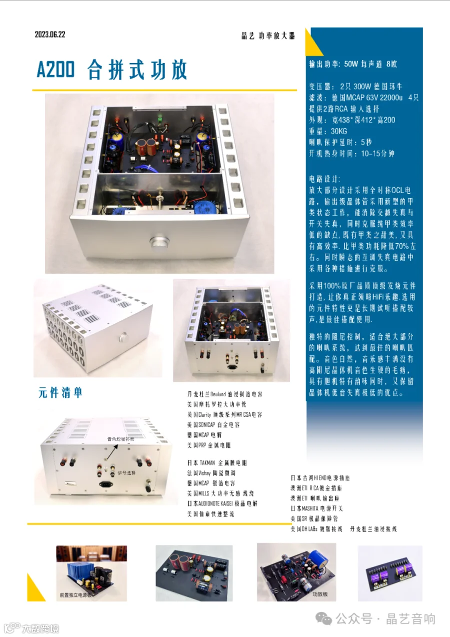 晶艺的纯后级功放提供两个版本的定制选择:A300与A200. A300 是终极最顶配置的设计,所有环节都是达到最好的选项,适配极品级别的喇叭音箱。A200的线路与A300完全相同,是一个考虑到性价比的选项。随着新颖元件的出现,这款机型同样具有极品级音质。A200适合配置hi end级别的喇叭音箱。两款机型的元件订做均可以推荐选择不同元件组合满足不同的客人要求,多款的机箱款式也可以选择。