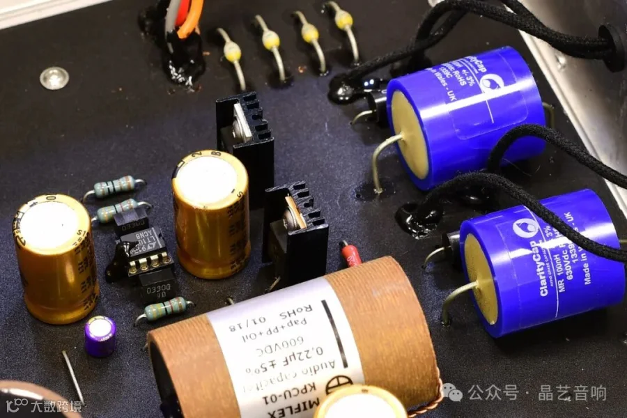 信号通道的耦合自然不能马虎。能达到3系列的要求,只有这样的搭配。英国Clarity TC系列加丹麦杜兰的耦合之王银铜混合CAST油浸电容。这个大容量的47U电容其实挺难选择,尝试过德国蒙多福的,比这个差太远,日本的KAISEI的无极电解电容,中音密度上不及这个英国的Clarity四极平衡电容。这个大个子其声音密度与低音的清晰平衡厚度均恰到好处。中高音的通道上杜兰的油浸电容就不需再作介绍,其独特的杜兰音色,像真度极高的音色还原能力,没有电容可比。