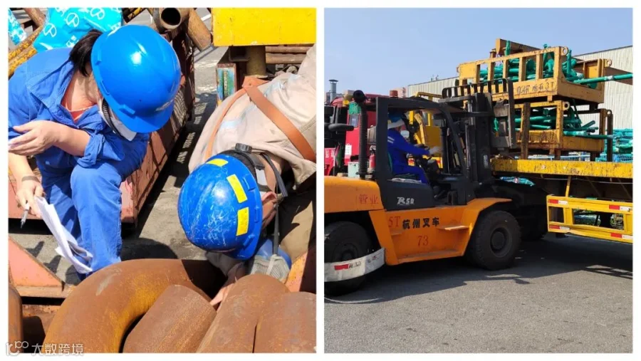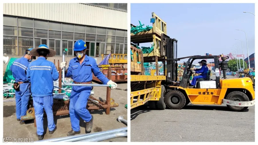 集托班长陈淑恒,对外场G3079船烟囱补装管子进行认真清点并交接;叉车司机配合起运课运输车辆装卸车的工作。