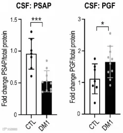 研究人员通过小鼠模型确定了脉络丛上皮细胞特别受有毒 CUG 扩增 RNA 表达的影响。为测试脉络丛转录组改变同样也会导致患病人类脑脊液(CSF)成分改变,研究者通过腰椎穿刺从 1 型强直性肌营养不良症患者(5 名女性,5 名男性)和非强直性肌营养不良症患者(3 名女性,4 名男性)处获取 CSF并通过蛋白质印迹分析脑脊液成分改变。
