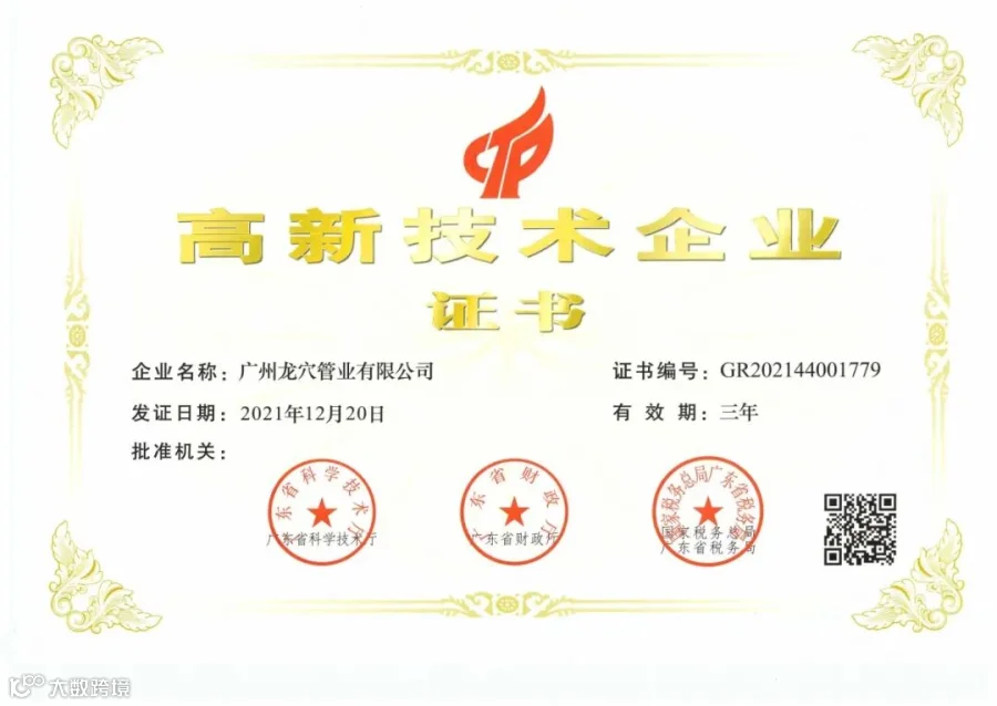 党的二十大报告指出要完善科技创新体系,坚持创新在我国现代化建设全局中的核心地位;强化企业科技创新主体地位,发挥科技型骨干企业引领支撑作用。近年来,龙穴管业积极响应国家政策,不断发展和提升科技创新能力,先后荣获“国家高新技术企业”“广东省创新型中小企业”评定。