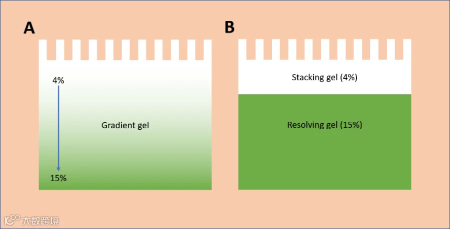 梯度胶 (A) 与等度凝胶 (B) (图源:网络https://bitesizebio.com/47184/gradient-gels/)