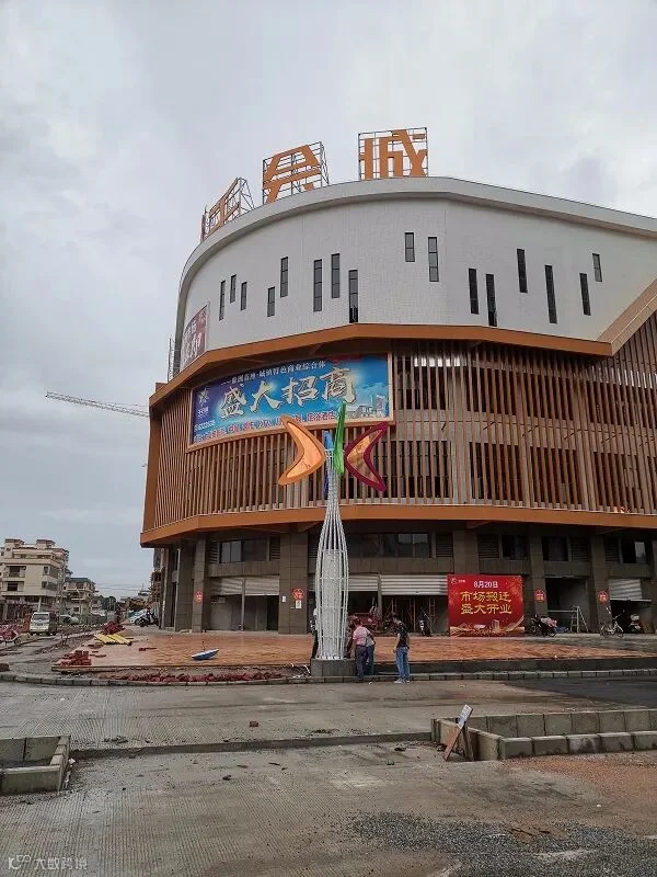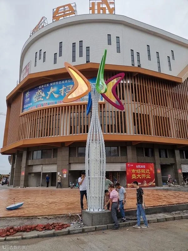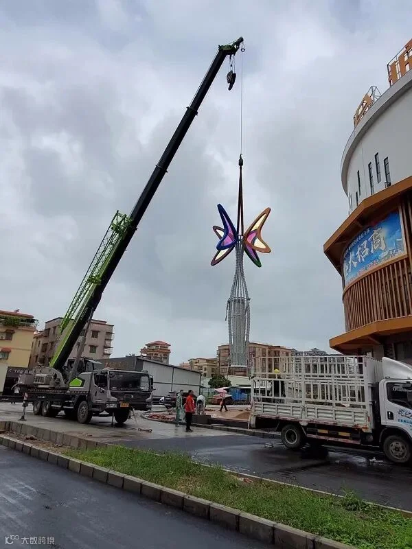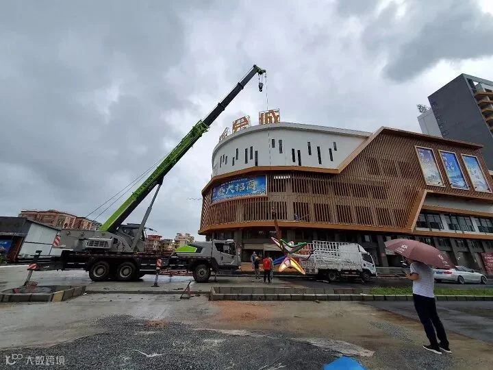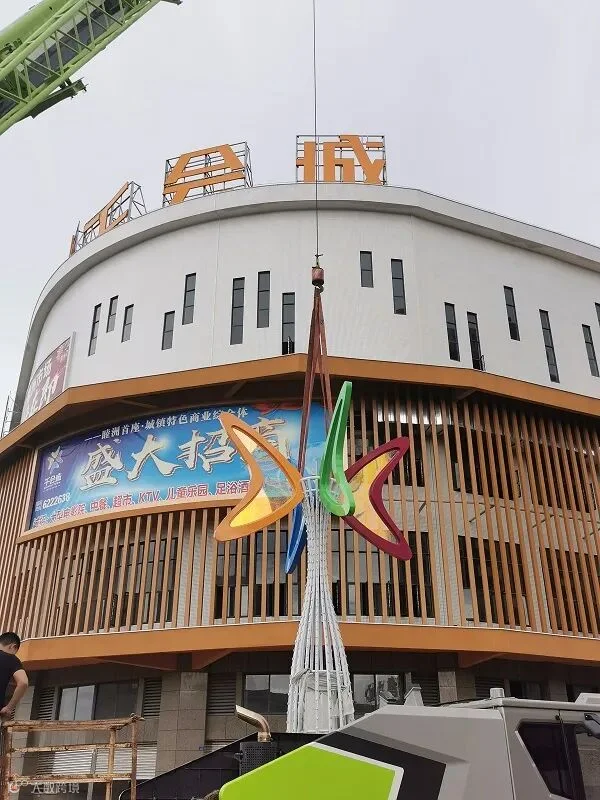 8月13日,冒着濛濛细雨,豪泰照明公司的售后安装团队到达了新建成的大型商场—千会城,准备进行大型景观灯的安装工作。