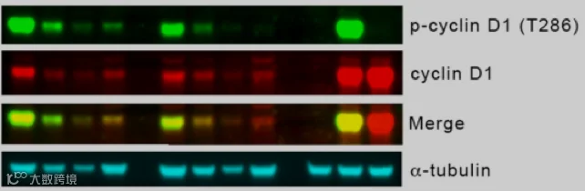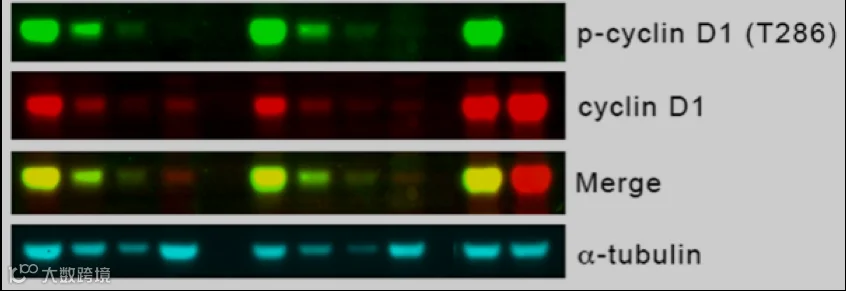 在⼀篇研究论⽂ “CRL4AMBRA1 is amaster regulator of D-type cyclins”(Nature,2021)中,研究者使⽤了⼀种⾮常“⾼级”的多⾊荧光磷酸化 WB 实验⽅法 ,同时做出了磷酸化、⾮磷酸化蛋⽩条带,⼜做出了管家蛋⽩tubulin的条带,⽽且只使⽤了两种荧光染料。