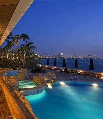 目前国内中高档住宅的景观中越来越多地用泳池、水景设计来营造自然优美的居住环境。水景包括静型和流动型两种。静型水域一般采用浸水式投光灯,但要注意安装角度,避免产生眩光;流动型水景(如瀑布、喷泉)一般将灯具安装在水下落处,主要光束集中在水柱和喷水端部的水花。当使用彩色滤光片时,应根据不同的透射比正确选择光源功率。为考虑人身安全,不管是否允许进人的水域,0区内都应采用12V及以下的隔离特低电压供电,其隔离电压器应在0、1、2区以外,并在0、1、2区内作局部等电位联结。