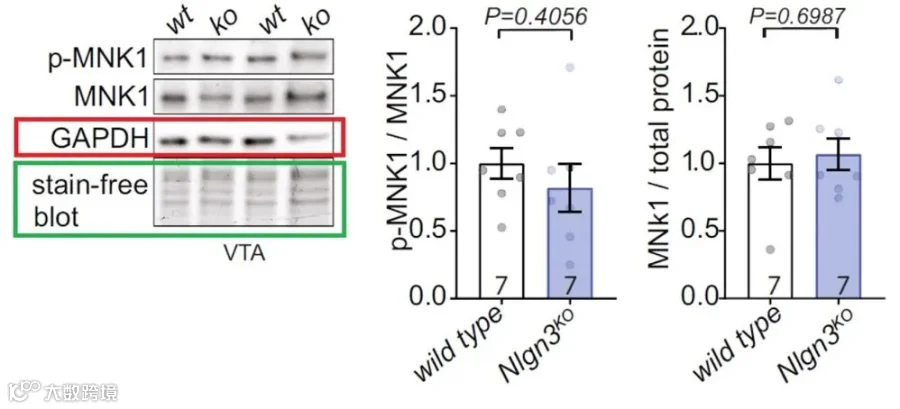 Western blot实验用来确定敲除NIgn3基因后小鼠脑组织中,磷酸化eIF4E及磷酸化MNK1水平的变化。研究者发现GAPDH的表达差异很大(红框),不适合作为内参使用;而Stain-Free总蛋白(绿框)显示出了极佳的表达一致性,从而被研究者选择为内参定量标准。