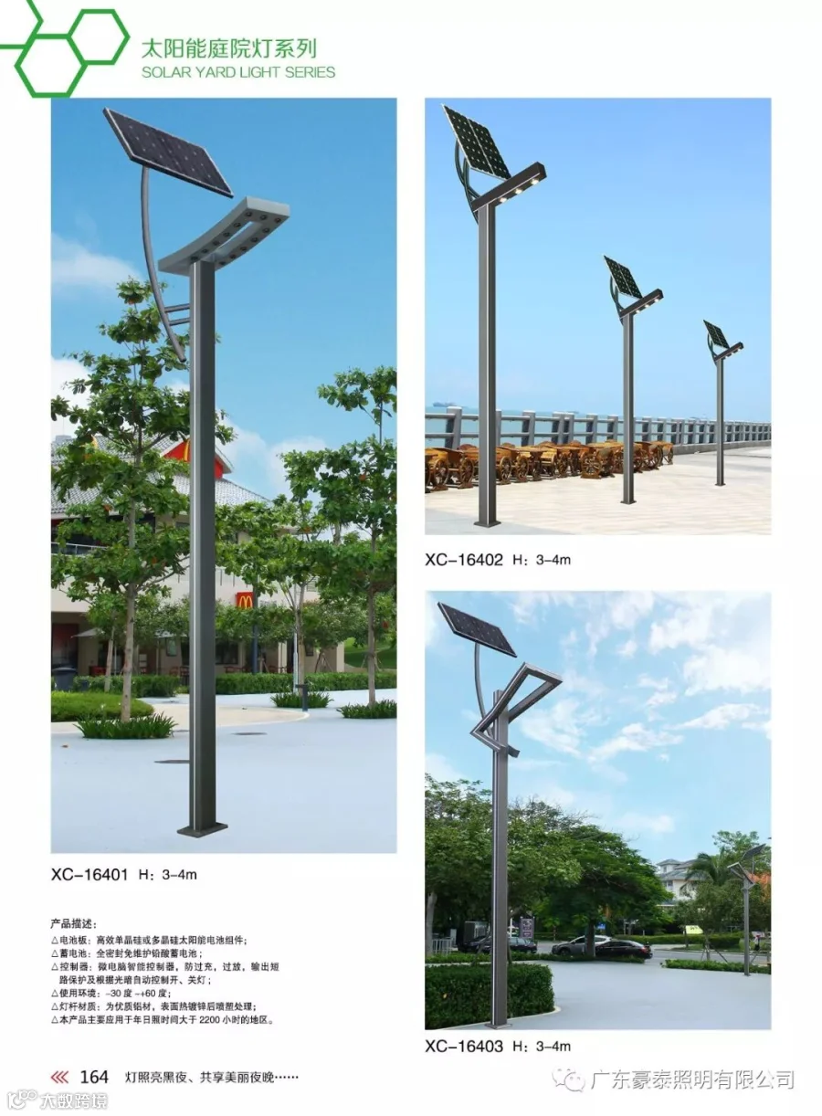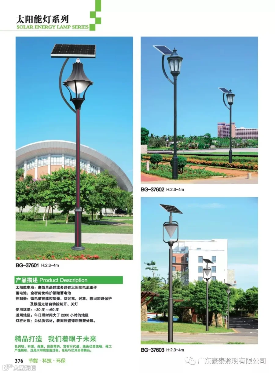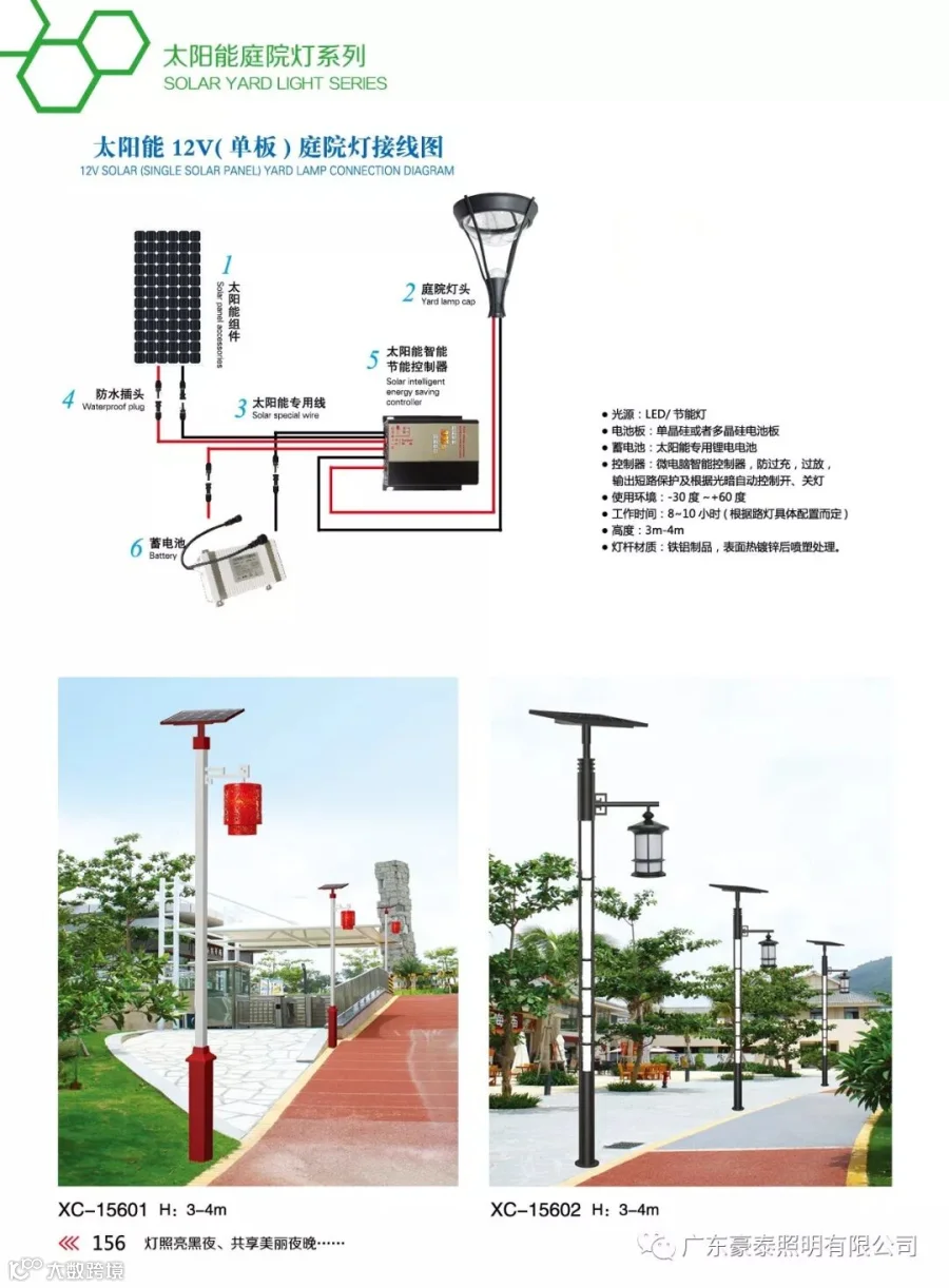 无需铺设地下线缆,无需支付照明电费,太阳能庭院灯所采用的关键部件 太阳能电池板、太阳能直流路灯智能控制器、 免维护蓄电池、照明灯具均经过国家发改委/GEF/ 世界银行 光伏产品认证。主要适用于城市道路、小区广场、工业园区、旅游景区、公园绿化带等场所的亮化照明。