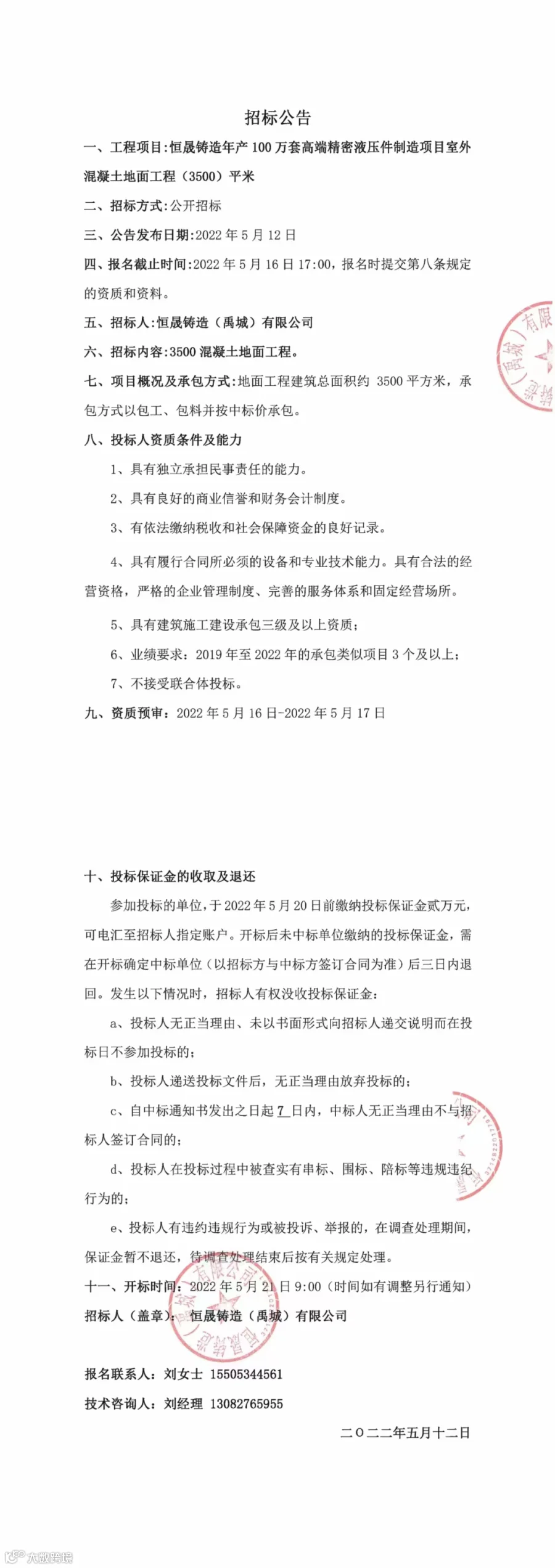 恒晟铸造(禹城)有限公司室外混凝土地面工程招标,诚邀您的参与!