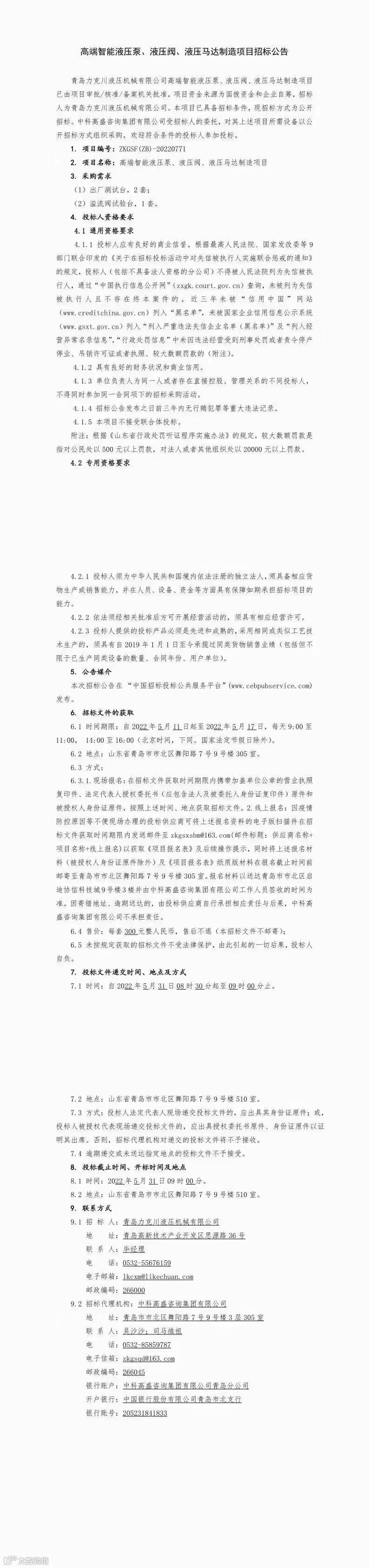 力克川液压机械有限公司拟进行试验台的招标,诚邀您的参与。