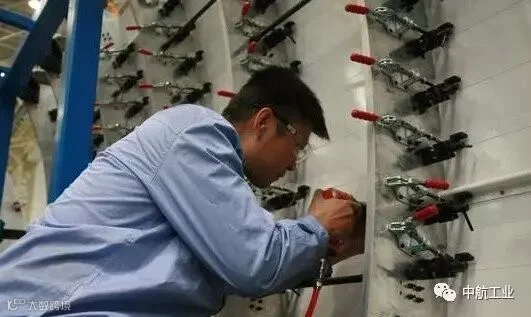 C919试飞改装人员进行测试线缆制作
