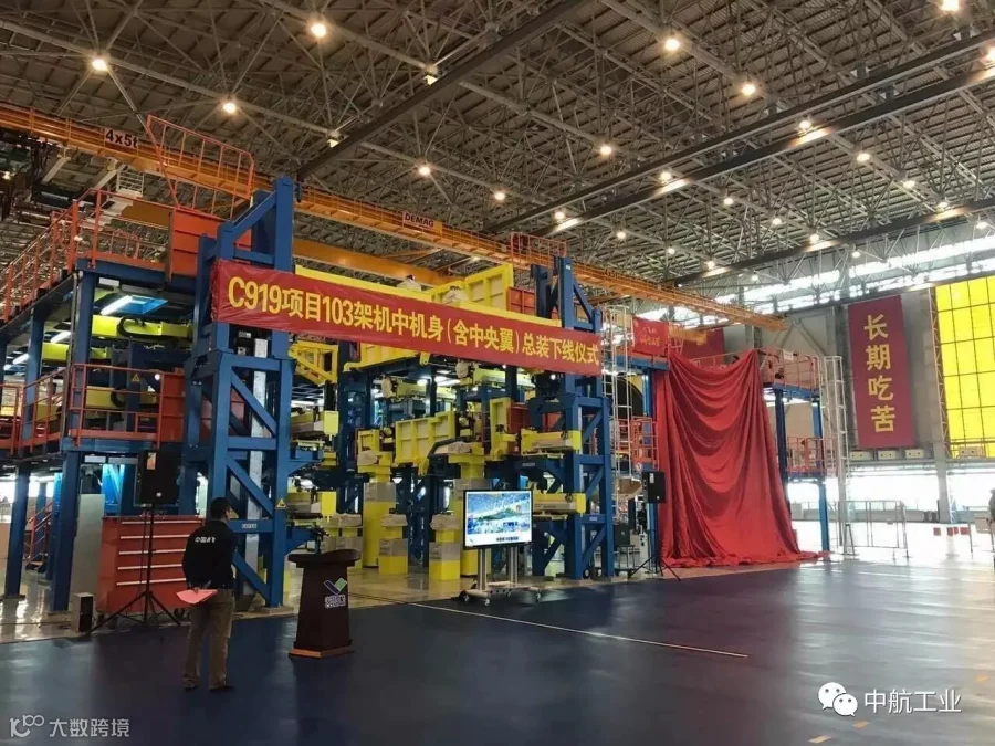 由西飞制造的C919大型客机翼身组合体中机身、外翼翼盒总装大部段成功下线。