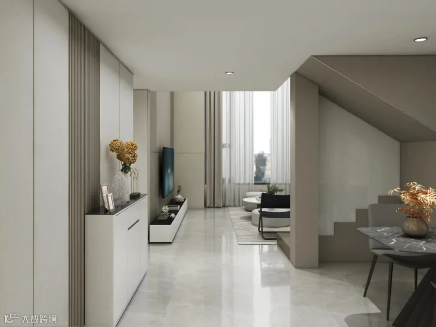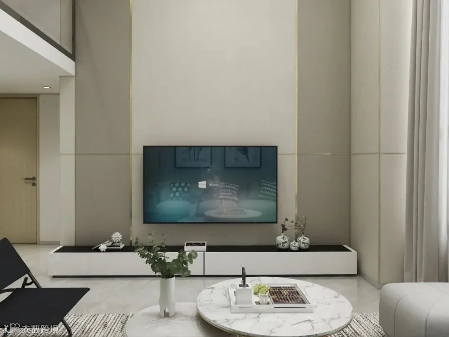 客厅与二楼空间打通,空间看起来更加宽敞明亮。电视背景墙采用白色护墙板,线条简约利落。现代简约风的客厅,主要运用了浅谈可可、云锦等相近似色搭配,利用深浅打造空间层次感,让人感觉非常协调融洽。