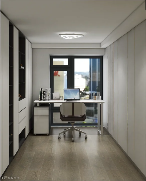 进门靠墙打造顶天立地大书柜,贴墙收纳书籍和杂物。窗口光线最好的位置留作办公区。屋内使用白色墙板,增加了小空间书房的折光率,书房更明亮净洁。