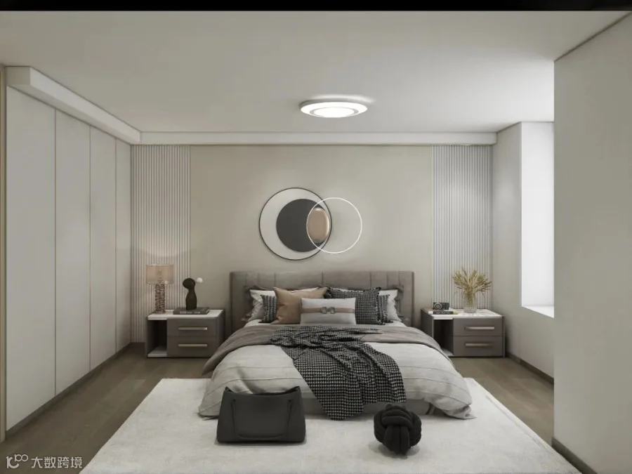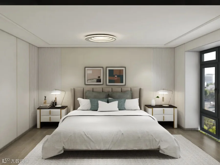 父母在一楼房间居住,更好关注家里的动静。在一楼还设有一个衣帽间,给爱时尚的太太使用。卧室配色以淡雅素净为主,背景墙面采用云纱白+云锦色温柔耐看,床头柜和床也是选用低调的颜色,整体营造出安静舒适的睡眠氛围。