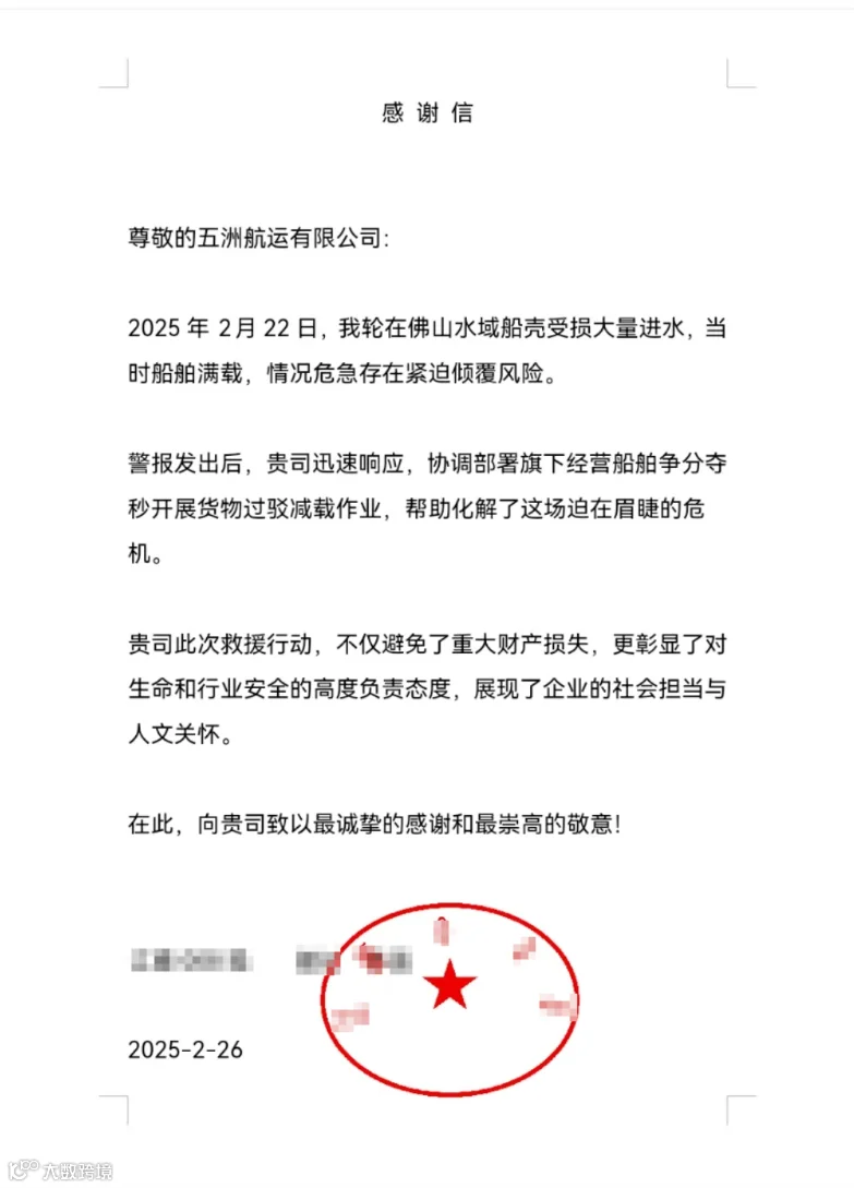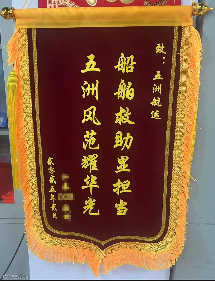 被救援船只授予五洲航运感谢信及锦旗