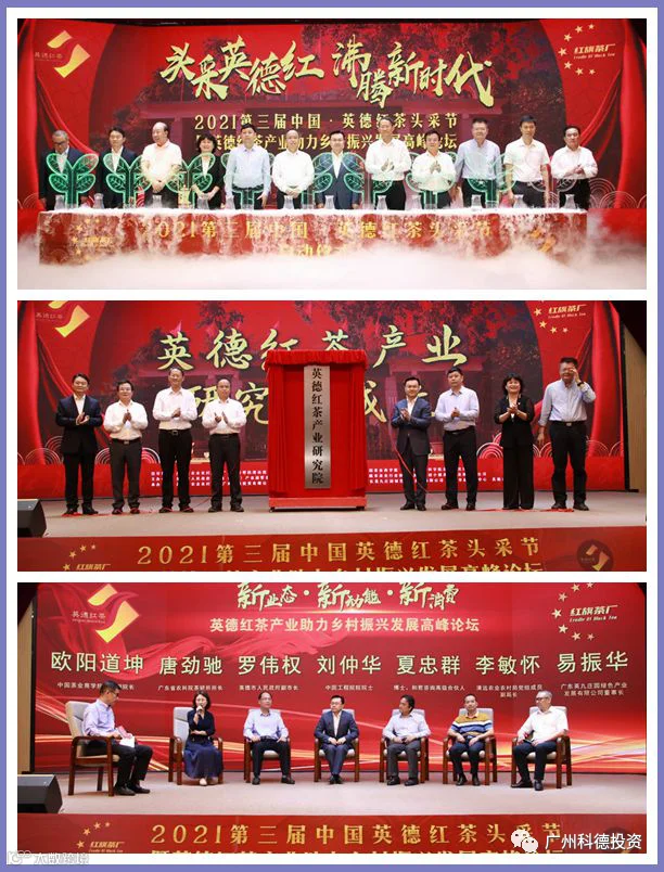 4月1日,主题为“头采英德红,沸腾新时代”的第三届中国英德红茶头采节暨英德红茶产业助力乡村振兴发展高峰论坛在红旗茶厂成功举办。清远市副市长雷玉春,中国工程院院士、清远市人民政府顾问刘仲华,广州开发区党工委委员、管委会副主任黄东,清远市人民政府党组成员、广州对口帮扶清远指挥部副总指挥、广州市派驻清远市精准扶贫工作队队长陈孝安,广德(英德)产业园党工委书记、管委会主任彭志文,清远市农业农村局局长张伟杰、广东省茶业行业协会会长穆有为,英德市人大常委会党组书记、主任陈子匹,英德市委副书记罗振宇,科学城(广州)投资集团副总经理王宏钢共同参与、见证了开采仪式。大屏幕同时连接到头采节分会场,直击采摘第一颗春芽。下午举办了主题为“新业态 新动能 新消费”的高峰论坛。清远市委常委、副市长,广州对口帮扶清远指挥部总指挥严志明,英德市副市长罗伟权出席活动并致辞。