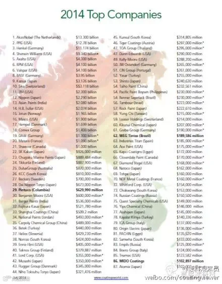 与2013年相比,2014年排行榜上出现3个新公司:Pintuco(哥伦比亚),WEGTintas(巴西)和MIDOCoatings(埃及)。其中哥伦比亚的Pintuco公司去年年销售额为6亿2999万美金,跃居排行榜29位。