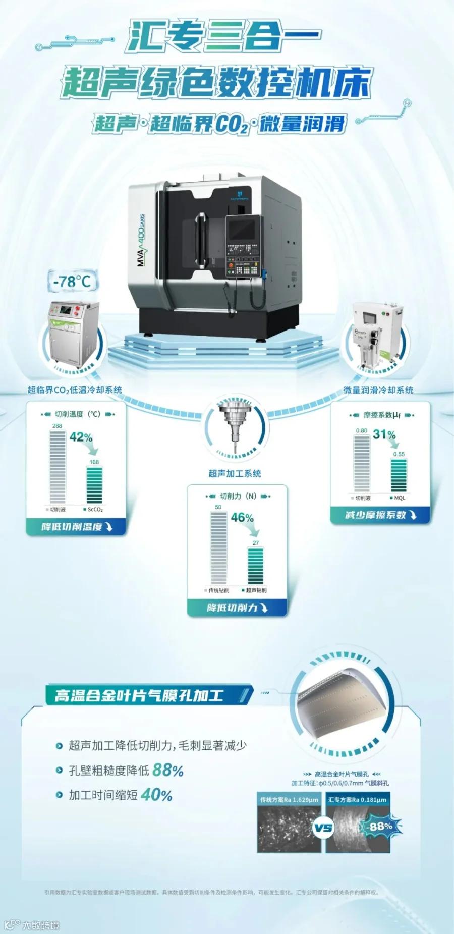 在汇专超声绿色加工整体解决方案中,多用途超声绿色立式五轴联动加工中心灵活搭载汇专自主研发的超声、超临界CO2和微量润滑(MQL)三项技术,在加工过程中可使切削力大幅降低46%、切削温度降低42%、摩擦系数降低31%,已经成功加工新型高温合金叶片气膜孔、整体叶盘、氧化铝陶瓷叶盘、致密氮化硅飞行器前端部件、低碳高合金钢齿轮等飞行器零部件,加工优势明显,可显著提高加工效率、延长刀具寿命、提升工件表面质量。
