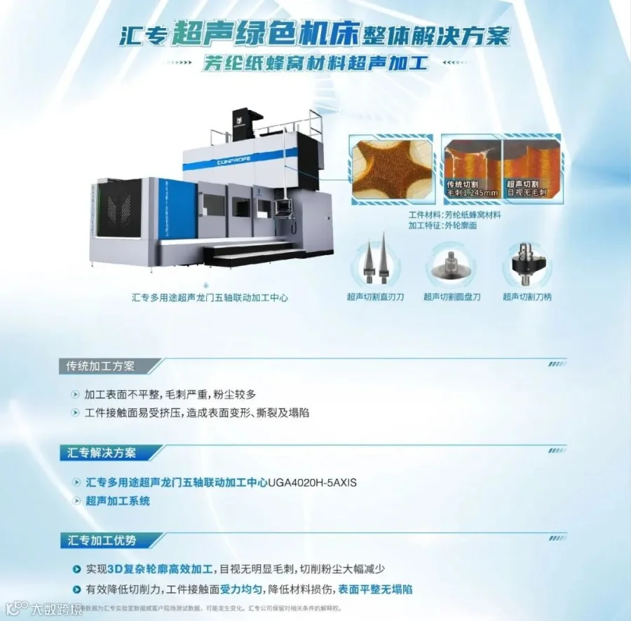 而汇专多用途超声龙门五轴联动加工中心灵活搭配汇专超声加工技术、超声切割圆盘刀、 超声切割匕首刀,很好地解决了蜂窝材料工件表面易变形、撕裂、塌陷以及毛刺严重等加工难题,实现3D复杂轮廓高效加工,降低材料损伤,使表面平整无塌陷,且目视无明显毛刺,受到了航空航天客户的高度认可。