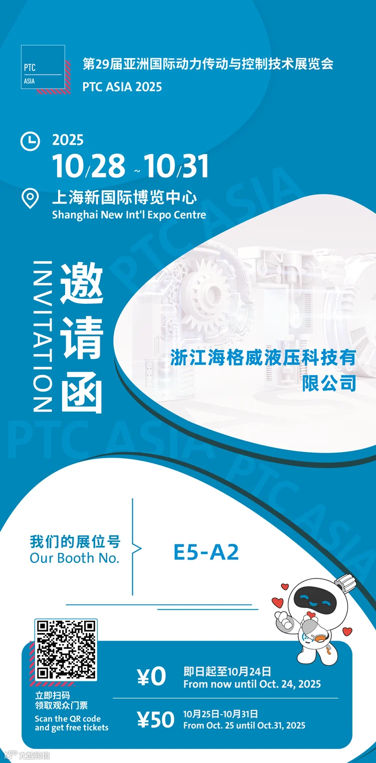 2025 年第 29 届亚洲国际动力传动与控制技术展览会(PTC ASIA 2025)即将盛大启幕,浙江海格威液压科技有限公司诚邀您莅临我司展位 E5 - A2,共探液压技术前沿趋势!