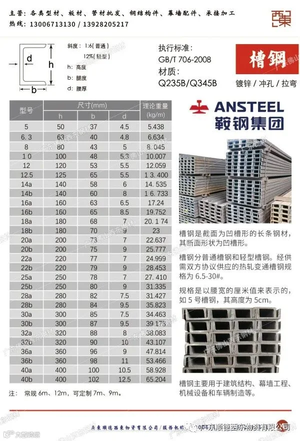 热镀锌槽钢是一种热轧长钢,其横截面为凹槽形,并且在支脚的内侧具有倾斜度。主要用于建筑结构,车辆制造及其他工业结构。 14#及以下的产品主要用作建筑项目的pur条; 16#及以上主要用作车辆底盘和机械结构的框架; 30#及以上可以用作桥梁结构的受拉构件,也可以用作工业厂房中的梁,柱和其他组件。槽钢通常与工字钢结合使用。该标准可以在GB707-88中找到。