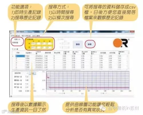 (6)生產記錄:查看指定機台的即時生產狀況或查詢該機台的歷史生產記錄。以MDI父子視窗方式呈現,可選擇「即時生產記錄」或「歷史記錄」。其中即時生產記錄除了會顯示即時的生產條件外,亦顯示平均統計模數的生產統計值,如:單位、最大值、最小值、範圍、平均值、品管值和公差值;歷史記錄可依「日期搜尋」或「模次搜尋」來搜尋該機台的歷史生產記錄,並另有曲線圖分析歷史記錄的狀況。