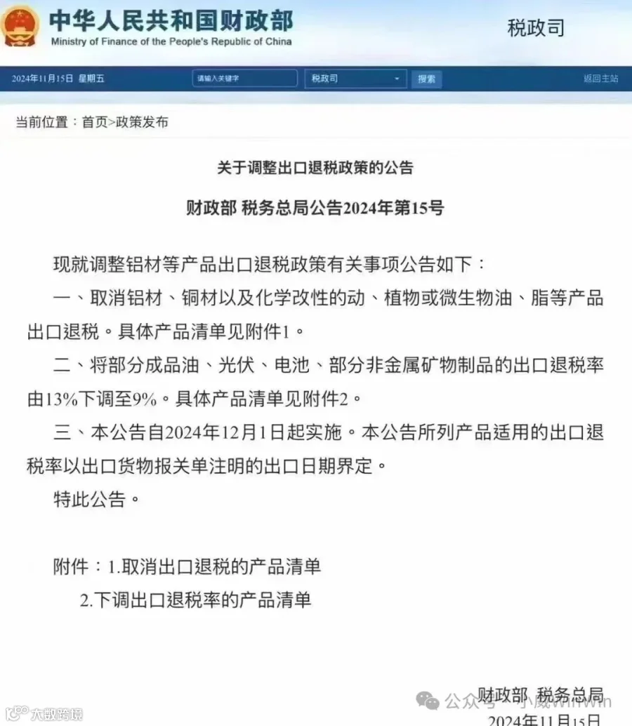 11月15日,税政司发布了最新出口退税政策调整,具体变动如下:
