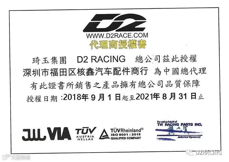 台湾的D2 Racing是获得TUV / ISO 9001:2015,欧盟TUV Osterreich和FIA认证的合格制造商,并获得了WORLD“ARTC”(汽车研究测试中心)的测试报告。