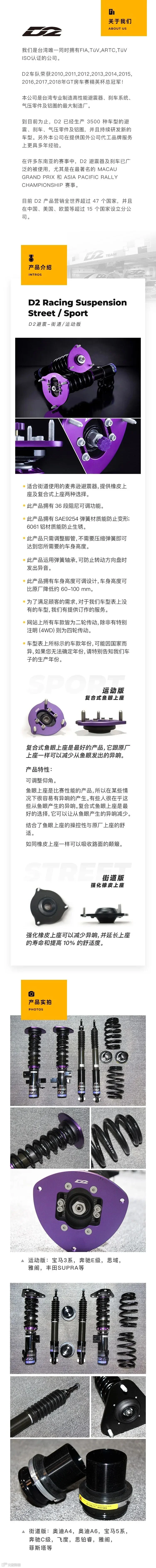 在制造工艺上,D2在中国本土销售的避震均针对中国路况而设计,对避震油压阻尼和弹簧K数进行了本土化调教。同时在生产设备上也投入巨资,引入目前世界先进的设备,例如数控CNC精密车床、全自动机械手臂、避震器弹簧自动化制造机器、研磨光滑RA检测机、金属材质化验机、微弱异声监听器、避震油线性化验机、偏心轴测试机等等,高水平的制造工艺也使其获得FIA、TUV认证。