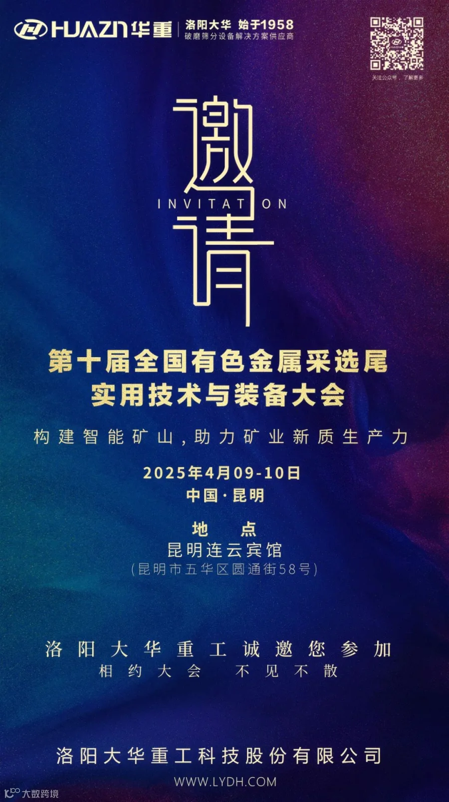 洛阳大华重工科技股份有限公司诚挚邀请您参加 2025年第十届全国有色金属采选尾实用技术与装备大会!本次大会将于 2025年4月9日—4月10日在云南昆明隆重举行,此次大会汇聚行业顶尖专家和企业领袖,共同探讨有色金属领域的新趋势、新装备与新突破!
