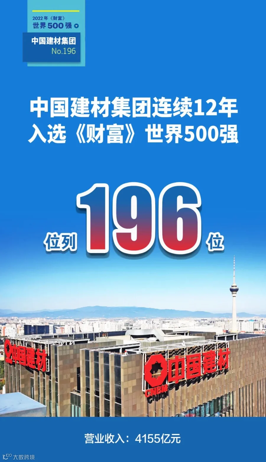 8月3日,2022年《财富》世界500强排行榜发布,中国建材集团以644.17亿美元连续第十二年入围该榜单,位列196位,继续稳坐全球建材行业榜首位置。同时上榜的建材企业还有法国圣戈班集团排252位,安徽海螺集团排353位,爱尔兰CRH排460位,瑞士霍尔希姆公司排488位。