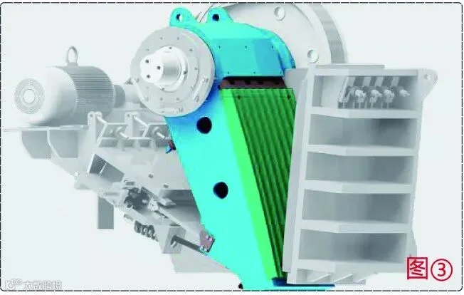 重型动颚总成采用锻造的重型偏心轴、高质量重载滚动轴承、FEM分析优化的动颚体,保证了动颚总成耐冲击性和稳定性高;迷宫式密封、集中润滑系统保证了轴承油脂不被污染、润滑更加便捷,使其运行时间更长、稳定性更好。见图③