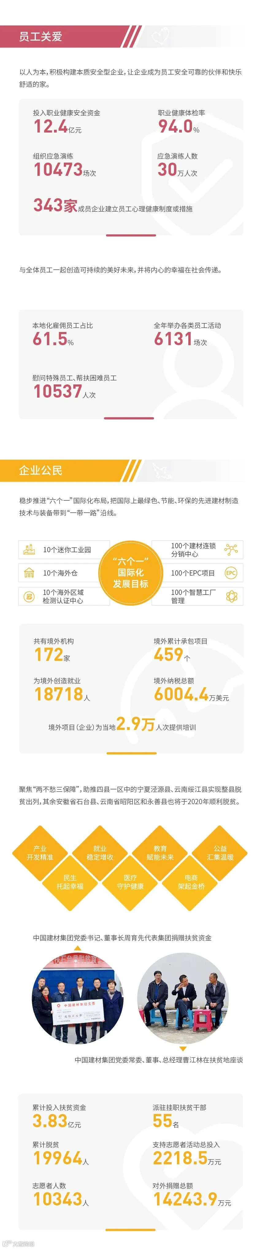 中国建材集团2019年可持续发展报告是建材人讲述建材故事的平台,是相关单位和部门的大力支持让报告内容更充实,案例更鲜活,是每一位为报告辛勤付出的个人共同讲好属于建材人的责任故事。