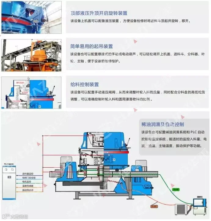 PLS系列立式冲击破碎机采用瀑布流分料系统,将来料按一定的可调控制量分流成两路,一路物料自中心入料管引入水平方向高速旋转的叶轮内腔,另一路物料从进料斗圆周的多个溢流口落入设备内腔,进入叶轮内腔的物料通过叶轮高速旋转加速从三个或多个发射口抛出,与溢流落下的物料在叶轮圆周的破碎腔区域发生强烈的自冲击破碎,或与设备破碎腔壁的金属反击板撞击破碎。根据工况条件或破碎物料的不同,也可通过控制入料方式,从而实现“石打石”和“石打铁”两种破碎模式的转换。