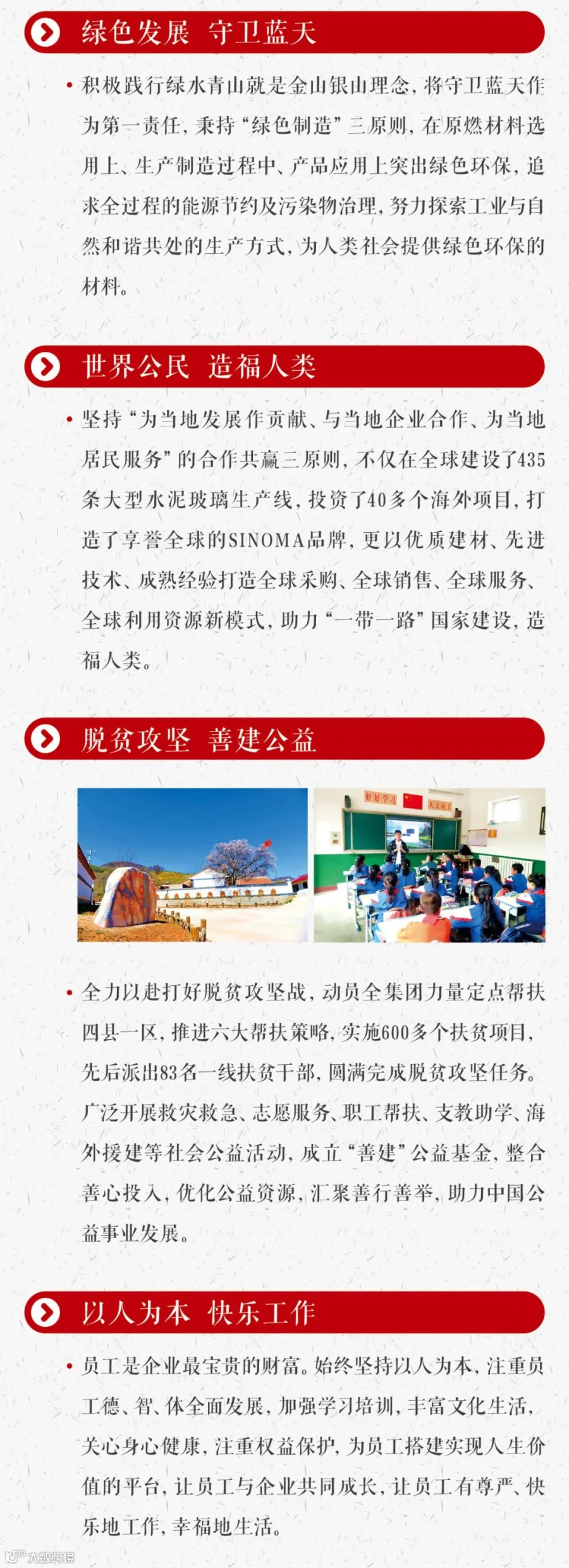 同时文化建设关乎企业发展和每位员工自身的幸福感。我们都是企业文化的亲历者、感受者,希望大家深度挖掘发生在身边的文化故事,写下你正在经历的与中国建材的不解之缘,表达你所充分认同和愿意付出的点点滴滴,巩固提升我们共同的文化成果。