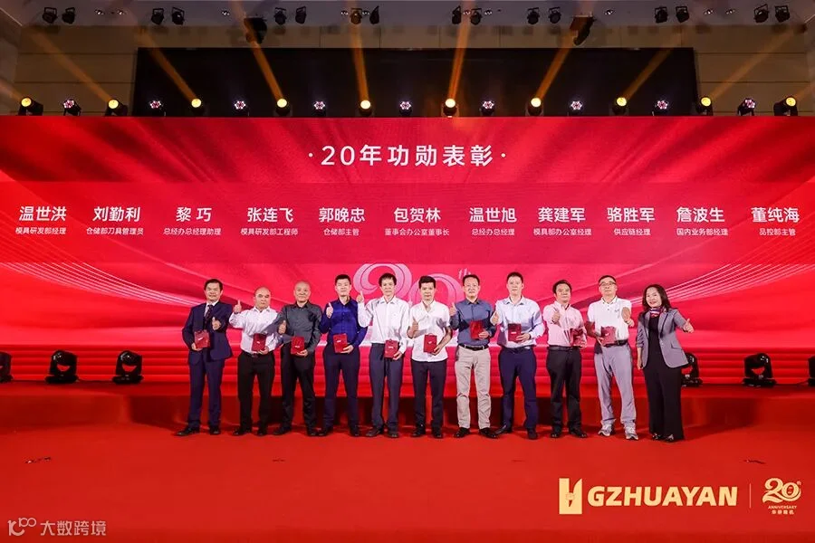 领导致辞后,进入20年老员工颁奖环节,两位创始人为一直在华研兢兢业业工作20年的9位员工颁奖并致以最诚挚的感谢。