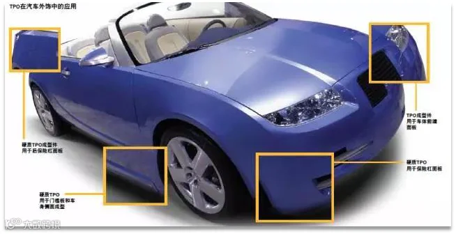 在汽车外装件中“硬质”TPO,主要用于保险杠、散热器、底盘、车身外板、车轮护罩、活动车顶及其他保护胶条、挡风胶条等。