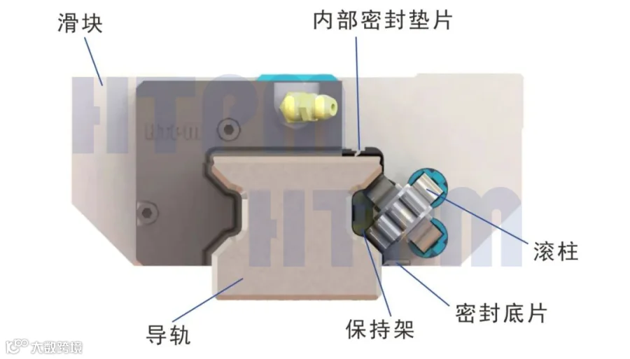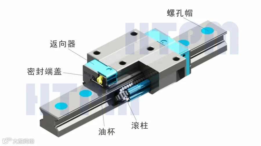 返向器采用高强度的工程材料制成并引导滚子反向连续的循坏运动。密封端盖和密封底片是防尘的必要部件。导轨副的润滑通过注油杯注入润滑剂来进行。