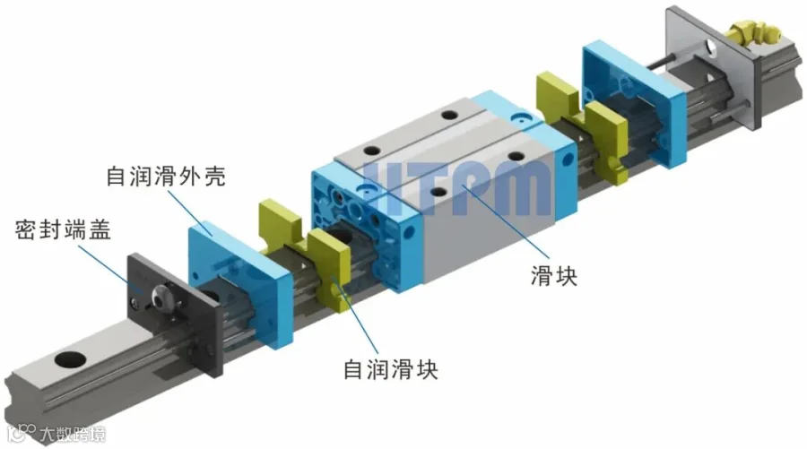 自润滑块是一种新型的多孔高分子材料与润滑油脂一体成型的润滑部件,安装在滑块两端,通过与导轨沟槽面接触,不间断释出新鲜的润滑油,从而实现导轨副润滑。