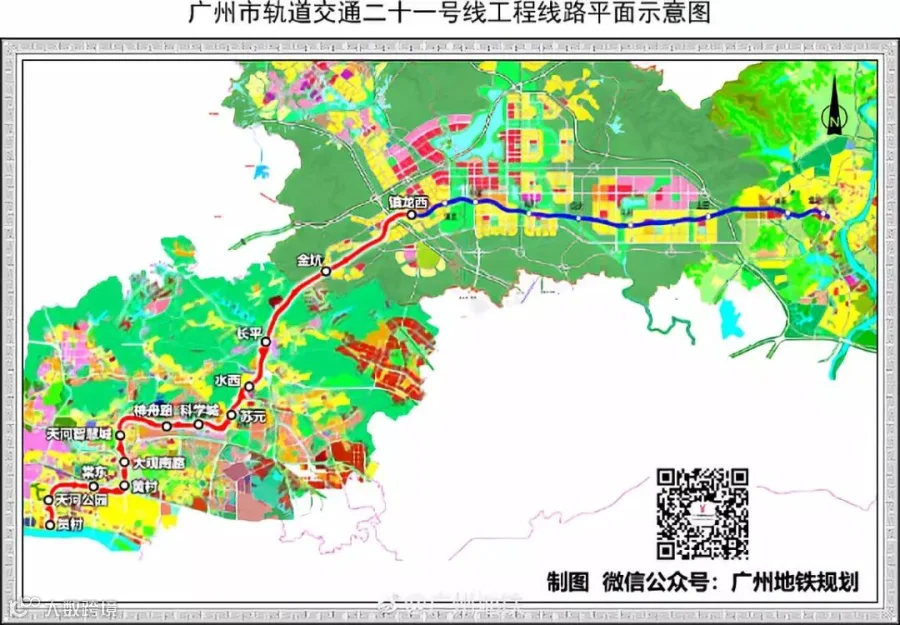 地铁21号线全长约61.6公里,去年已开通镇龙西-增城广场路段,剩余的员村至镇龙西段,长35.3公里,共设12座车站:金坑、长平、水西、苏元、科学城、神舟路、智慧城、大观路南、黄村、棠东、天河公园、员村。