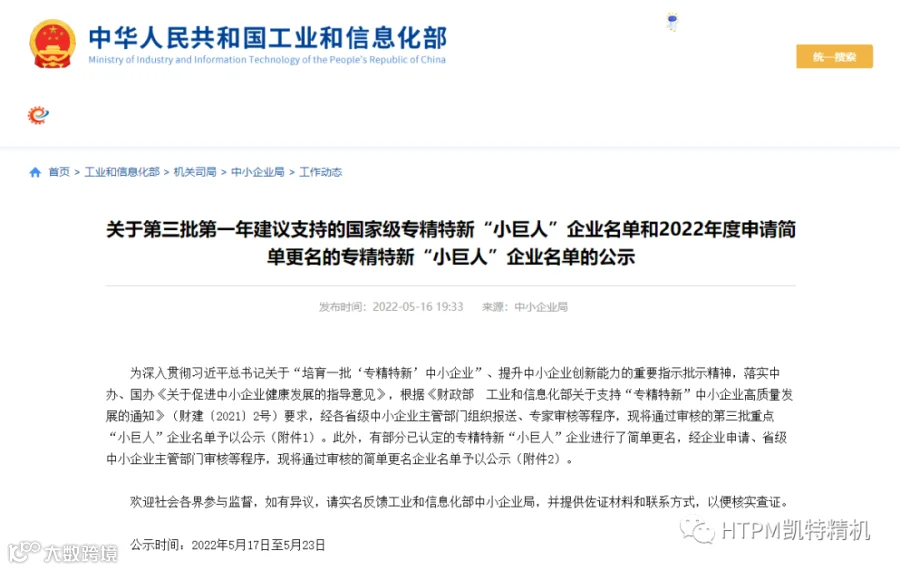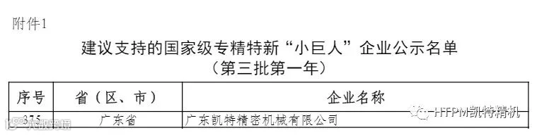 日前,工业和信息化部中小企业局公示了第三批第一年建议支持的国家级专精特新重点“小巨人”企业名单,凯特精机榜上有名。