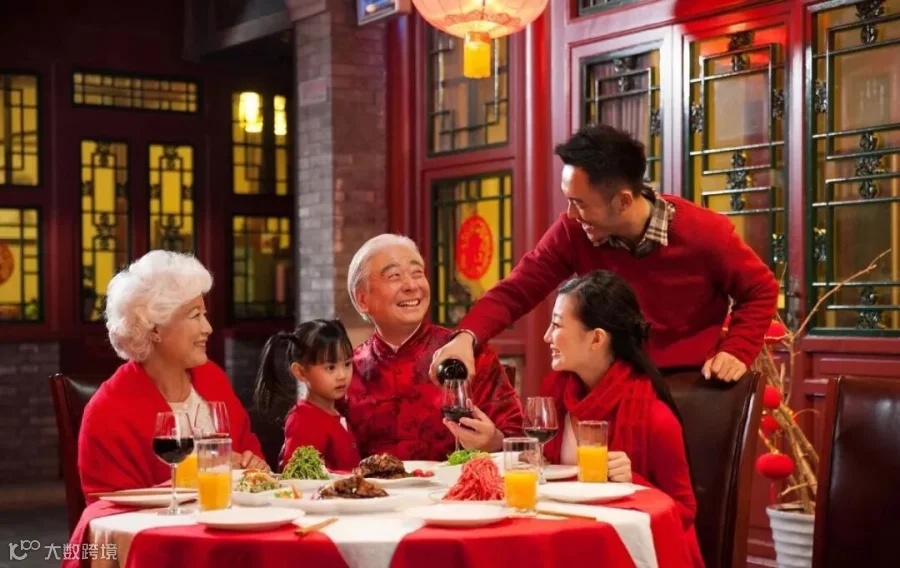 年夜饭又称团圆饭。年三十晚那天,人们准备丰盛的大餐,一家人围坐相聚,共度难得的团圆时光。