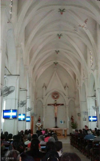 教堂内是尖形肋骨交叉的拱形穹隆,正门大门上面和四周拱璧分布的花岗棂,都是合掌式,门窗均为以颜色较深的红、黄、蓝、绿等色的七彩玻璃镶嵌,光彩夺目。