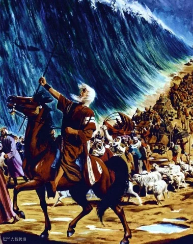 14:28 回流的水淹没了法郎的战车、骑兵和跟着以色列子民来到海中的法郎军队,一个人也没有留下。