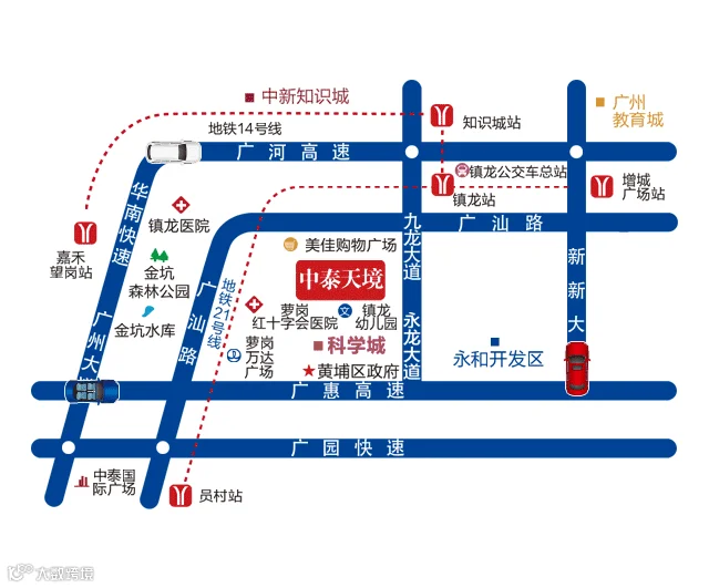 中泰天境花园坐拥地铁21号线(建设中)、地铁14号线(建设中)以及穗莞深城际轻轨(建设中),项目紧邻镇龙地铁站,双地铁开通在即,穗莞深城际轻轨年底开通,快线2站到天河区、6站到珠江新城。