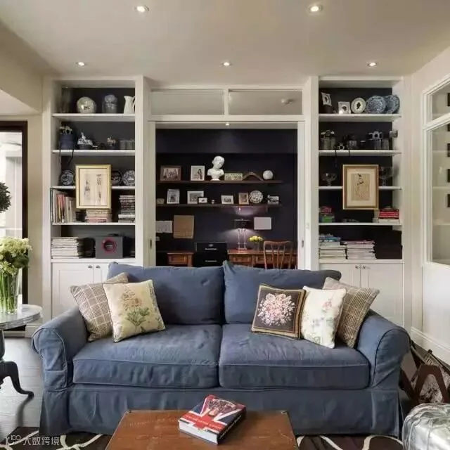 深蓝色的沙发放在客厅中间,整体随意自然,带有美式风格独特的慵懒随意性。